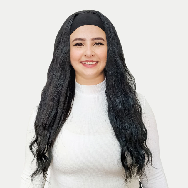 Linda peruca longa, com leve ondulado, de fibra orgânica. Fios com 55cm na cor 1B (preto). Detalhe para a faixa decorativa que oferece beleza e segurança. Tamanho único, ajuste com faixa interna de tiras autocolante e fixação por pentes internos com elástico. Siga as instruções do fabricante.